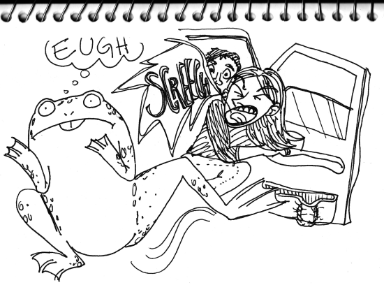 Inspired by a commercial where a frog hops into a car with a family inside. Hijinks and hysteria ensue, and at the end the mom throws her door open and the poor frog leaps to sweet, sweet freedom!
