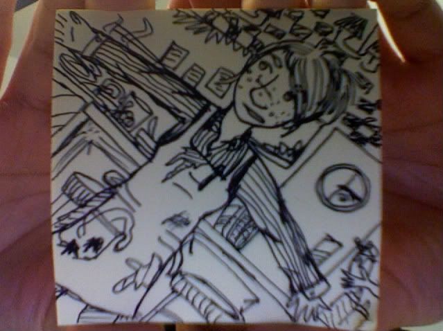 I was going to try and go for a bang like Nate mentioned, but then all my impending finals of DOOM ate up my time so I decided to stick to my recent theme of post it notes. I plan on continuing with a post it note drawing daily!